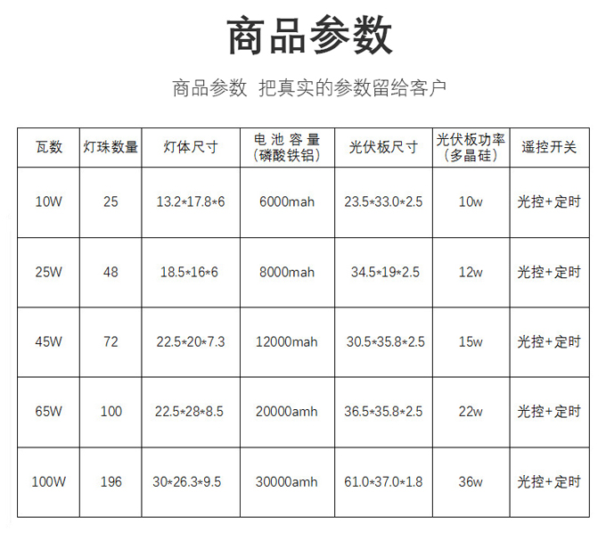 - 產(chǎn)品簡介:產(chǎn)品特點: 1.進口LED芯片,光通量超過330LM,使用壽命真正能做夠達30000小時,壽命保證 2.A級多晶硅太陽能板充電快,光電轉(zhuǎn)化高度20%,僅需5個小時可以達到滿電狀態(tài)光轉(zhuǎn)換高大17%堅固耐用,使用壽命可達15年 3.環(huán)保鋁電池優(yōu)質(zhì)A品電芯,容量高,內(nèi)阻低,可以最大電流放電,穩(wěn)定性強,循環(huán)使用壽命長,可以連續(xù)沖放電1000次,電池容量不低于額定容量的85% 4.太陽能燈專用延長線,耐拉、抗彎曲、防斷裂導(dǎo)電率高、低電阻、低損耗、抗老化