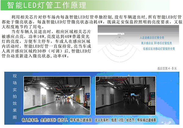 在資源短缺、節(jié)能環(huán)保的主形勢下,智能LED燈管可感控光照強(qiáng)度,減少無謂的電力消耗,是高用電量地下車庫照明的最佳選擇。