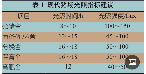 美國農(nóng)業(yè)生物工程學(xué)會建議后備 / 配懷母 豬合適的光照強(qiáng)度在 100 Lux 左右,光照時 間為每天 14 h ~ 16 h。
